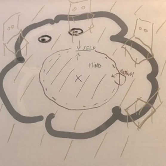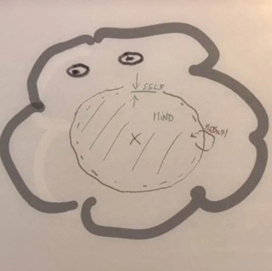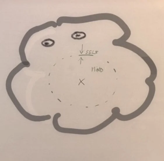 Een dergelijk mechanisme versterkt het besef van jezelf als een herkenbare vorm in het blikveld van anderen — een cruciale bouwsteen van sociale cohesie én van individuele zelfervaring. Het laat bovendien zien hoe het eerste-persoonsperspectief — het gevoel van 'ik' — altijd verbonden is met een derde-persoonsperspectief. Mijn binnenkant ontstaat doordat ik, net als de vroegste mensachtigen, aanvoel dat ik van buitenaf zichtbaar ben. Dat dubbele perspectief is een structureel kenmerk van menselijke ervaring — wat in onderstaande tekening wordt geïllustreerd: de sociale of mentale atmosfeer van de gemeenschap wordt een soort van blikveld vanwaaruit het 'zelf' vagelijk begint op te lichten. Er ontstaat een binnenruimte of psyche, die in eerste instantie nog erg poreus is, en waarbij binnen en buiten nog niet al te duidelijk van elkaar gescheiden zijn. Het 'ik' en de wereld schemeren nog door elkaar heen.