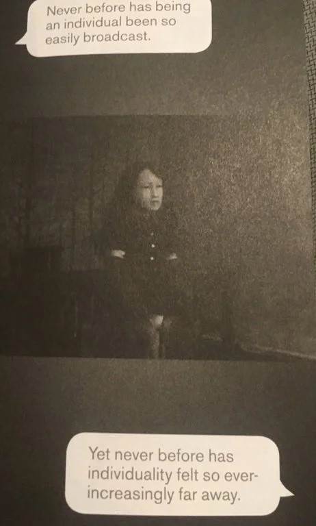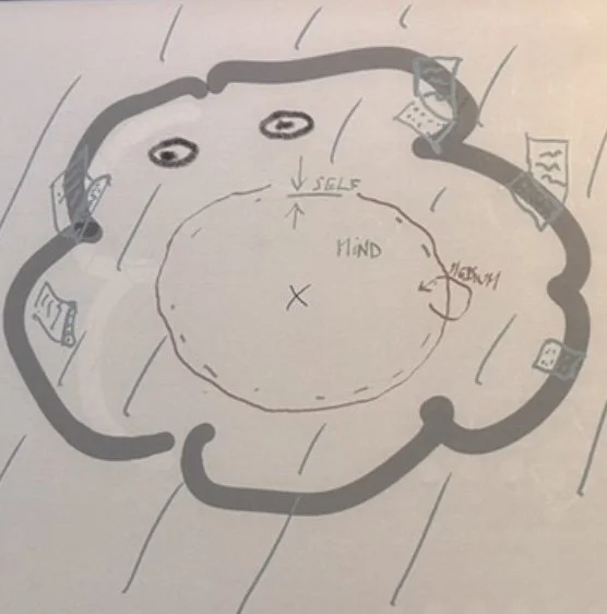 Onze identiteit leeft niet meer in ons, maar rond ons, in beelden, data, statistieken, algoritmische interpretaties. Dat onze identiteit of de beleving van onszelf altijd al een sociale bemiddeling was, wordt nu maar al te duidelijk, zelfs in die mate dat we onszelf tegenwoordig enkel nog lijken te kunnen beleven vanuit bemiddeling, vanuit representaties. De arcering op de tekening binnenin dreigt te verdwijnen, en we vervreemden van de eigen onmiddellijke ervaring (bewustzijn), ten voordele van onze sociale representaties.
